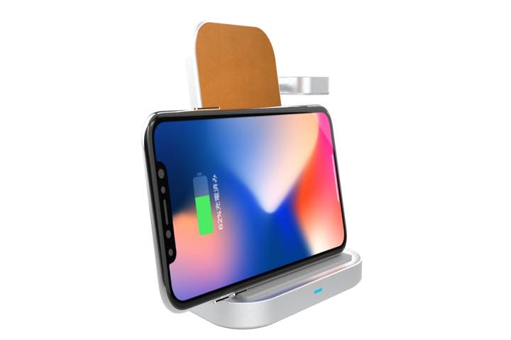 斜めに設置されたパッドにスマホを立てかければ、端末を自動的に判別して充電スタート。スマホ用充電パッドにはふたつのコイルが内蔵されているので縦置きでも横置きでも充電でき、充電しながらスマホを操作したり動画を観たりできます。