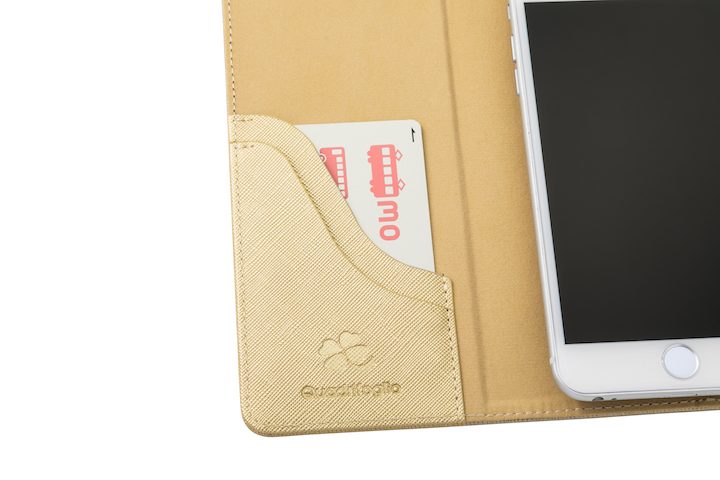 全機種対応の手帳型ケース。フラップ部分はマグネット内蔵のベルトによりしっかりと固定ができます。内側のカードポケットには、独自開発されたホルダー “RIPPLE”(リップル)を採用。縦横2点を固定することでカードが落ちるのを防止してくれます(I縦163mmまでのスマートフォンに対応)。また幸運の象徴でもある四葉のクローバーが刻印されています。