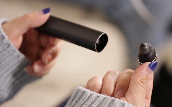 「TwoBow」の使い方は簡単で、筒型の充電ケースの両端にセットされているイヤホンを取り出してお互いの耳に嵌め、専用アプリを開いて “翻訳” をタップするだけ。その状態で会話をすれば、相手が話した言葉がリアルタイムに自分の言語に翻訳されてイヤホンから聞こえてくるのです。