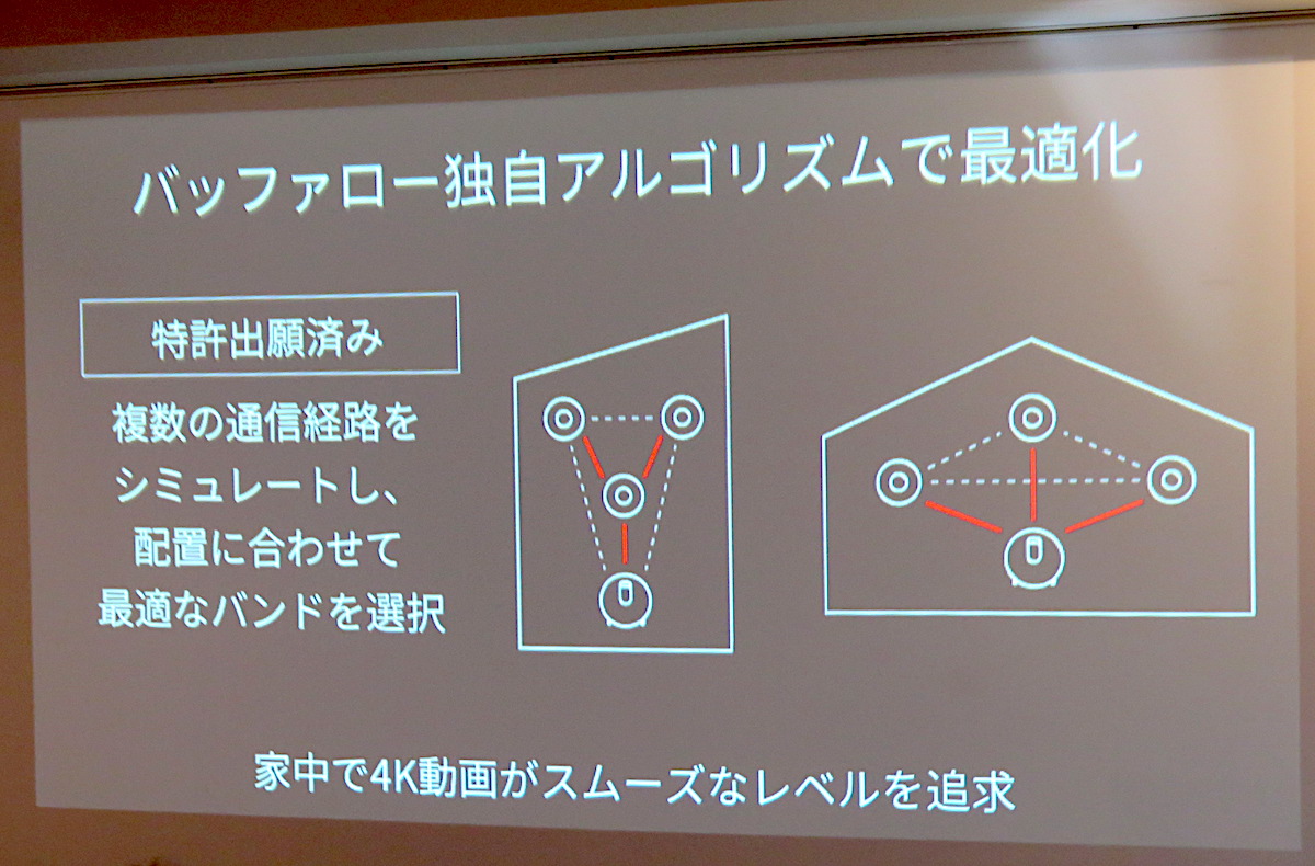 今年4月にグーグルが発売した「Google WiFi」もメッシュネットワーク技術を用いたものです。他メーカーからもメッシュネットワーク対応ルーターが続々とリリースされています。しかし、メッシュネットワークWi-Fiは、導入が簡単で通信が安定する反面、通信速度が遅くなりがちという弱点も指摘されていました。「AirStation connect」では、これを克服するために、複数の通信経路のパターンをシミュレートして、最適なバンドを自動選択する独自のアルゴリムを開発。「家中のどこでも高画質の動画をスムーズに再生できるネットワーク環境を実現できる」と自信を示していました。