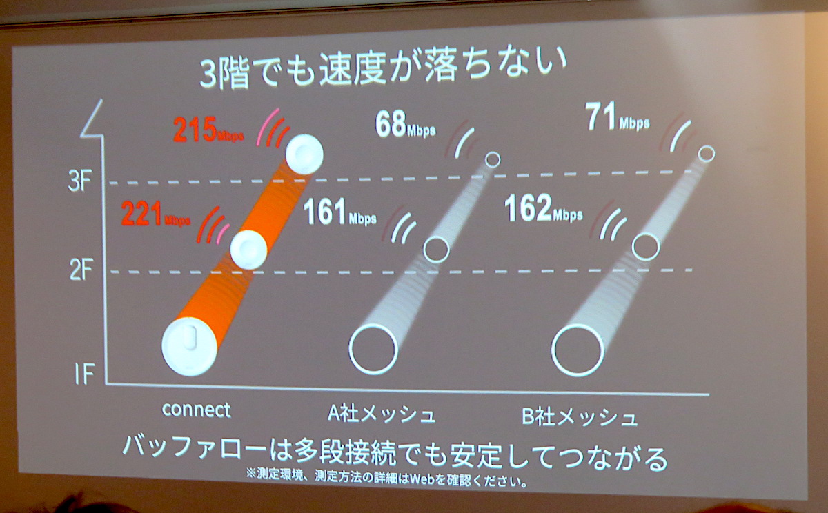 ▲他メーカーのメッシュWi-Fiよりも高速で安定することをアピール