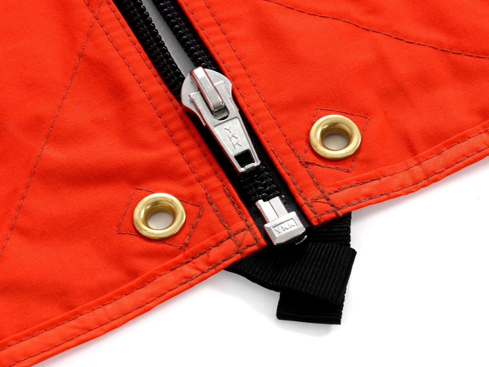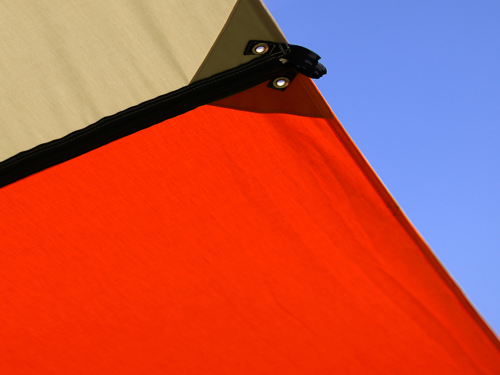 タープの素材は、アウトドアユースに適したポリエステルと自然な風合いが特徴のコットンを織り交ぜたポリコットン生地で、一般的なポリエステルのタープよりも影が濃く、火の粉に強いのも特長です。ファスナーは引張強度の高いもので、テープ部分は撥水処理が施されているので雨の侵入の心配もありません。