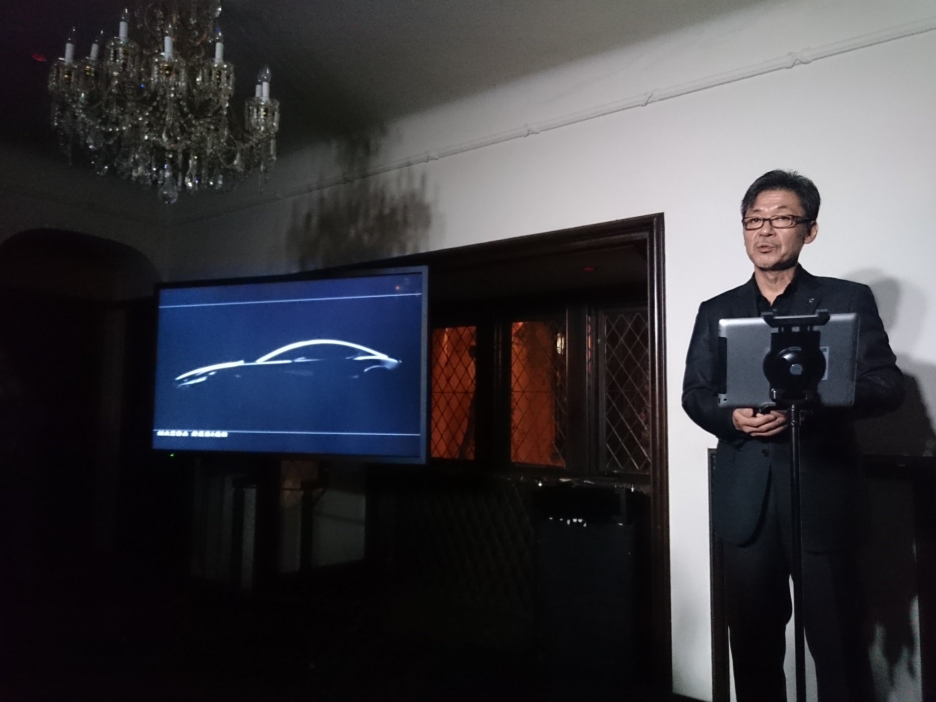 新型ロータリーエンジンを搭載するスポーツクーペをチラ見せするデザイン執行役員の前田育男氏。モニターに映された画像は、これまで発表されていない角度のもの。サービス精神旺盛!