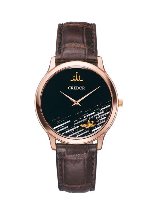 今年25周年を迎えた「キャリバー6870」の更なる飛躍をイメージして選ばれたのは、風を切って大空に翔け上がる鳳凰のモチーフ。漆塗りのダイヤルに、クレドールのマークと光り輝く鳳凰を堂々とレイアウト。この大胆な意匠を手がけたのは世界的にも名高い漆芸家・田村一舟氏です。