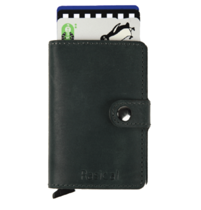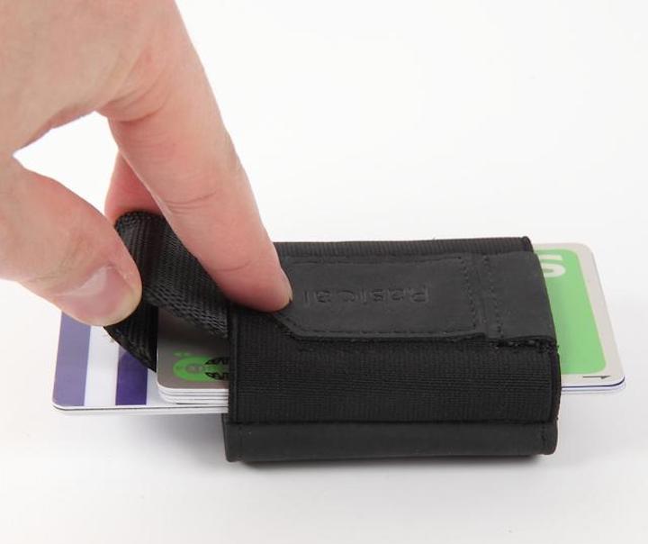 「エアーウォレット」の本体サイズはW103mm×D15mm×H63mmと、従来の財布に比べるとかなりコンパクト。アルミケースにカード6枚前後、外側にはカード2枚、貨幣ポケットにはお札を入れられます。もちろんスキミング防止ケースを採用。下部にあるレバーを引っ張るだけで、カードがワンタッチで取り出せてとても便利です。