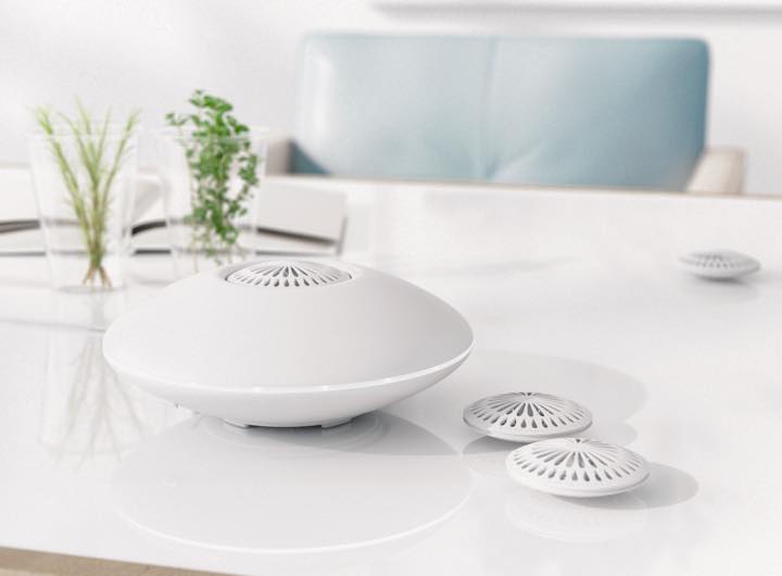 専用アロマカプセルは使い捨てで、香りの持続時間は連続200時間程度。本体同梱のグレープフルーツの他、グリーンムード、ローズ、ラベンダーなど合計6つのフレグランスをラインナップ、好みに合わせて後から追加購入できるようになっています。本体にはカプセルが2個入れられるので、香りの強さを個数で調整してもいいし、異なる香りをミックスして使う楽しみも。