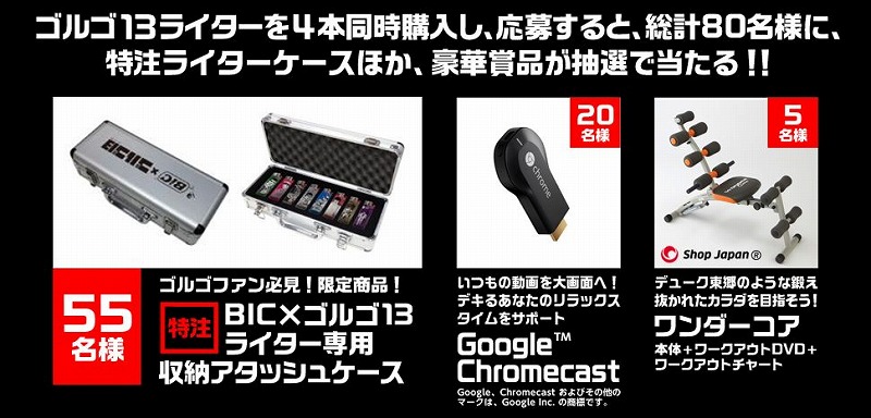 なお今回の発売を記念して、これも超レアなゴルゴ13ライター収納専用の特注アタッシュケースが抽選で55(ゴルゴ)名に当たるキャンペーンも実施、こちらもファンならお見逃しなく!
