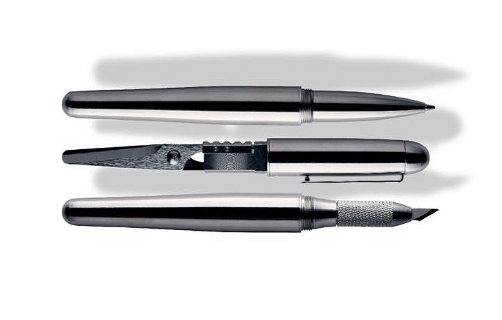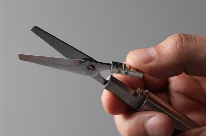 ペン先部分はオプション品のアートナイフ(カッター)に付け替えも可能。切る作業が必要な局面ではハサミとナイフ、両者を使い分けることも意外と多いもの。切る機会の多い職種の方はナイフを付けて両者をスマートに携帯できます。