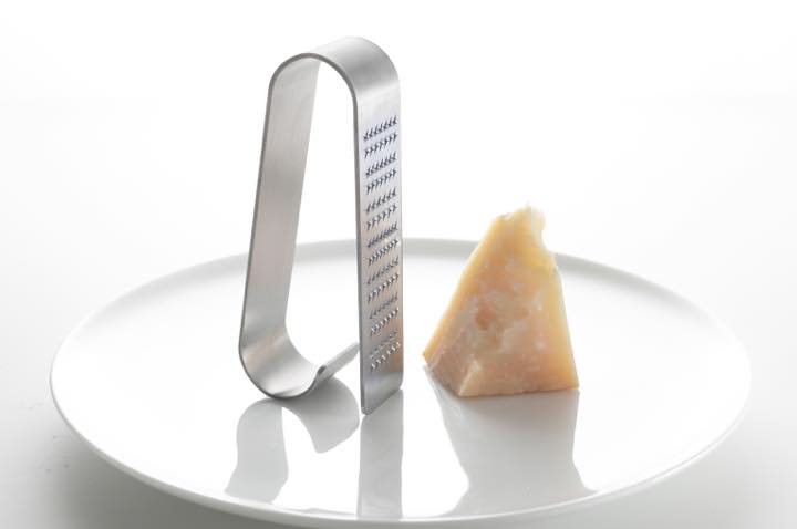 その「EAトCO」シリーズに新たに加わったのが、一枚のステンレスを曲げて作られた「Oros Handy」。約W28×D42×H100mmというサイズのトライアングルのようなフォルムの一辺を片手で握り、もう一辺のおろし金部分でチーズなどの食材をおろせる、シンプルなグレーターです。