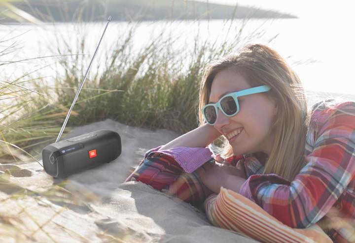 「JBL TUNER(チューナー)FM」(公式通販サイト販売価格9880円/税別)は、ラジオはもちろん、Bluetoothスピーカーとしての機能も搭載したポータブルスピーカー。FM放送と、通常ではAM放送が聞こえにくい場所や地域でもクリアな音質でAM放送を受信できる“ワイドFM”にも対応。