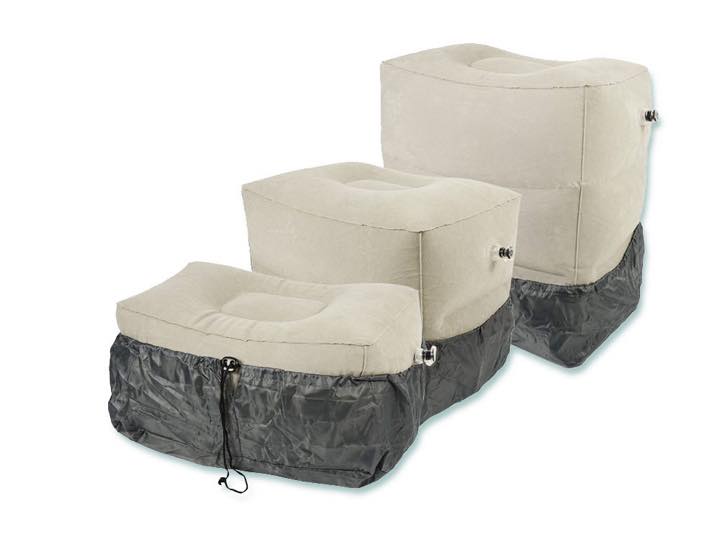 空気を入れた時のサイズは、最大で横幅390×高さ410×奥行260mm。空気注入口がふたつあり、空気の入れる量で3段階の高さに調節が可能だ。飛行機や新幹線、車の座席の前に置けば、簡単にフットレストになり、長時間の移動も足を伸ばしてリラックスできる。