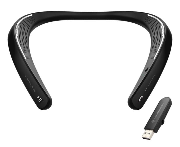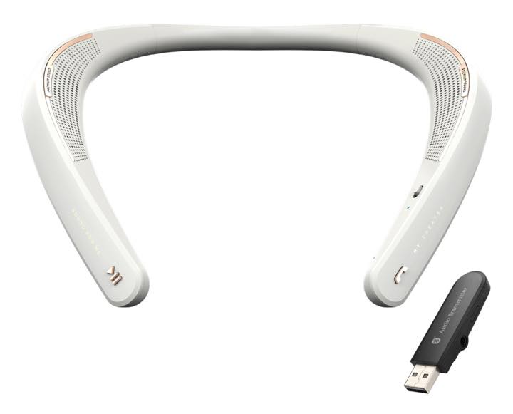 ソフトバンクコマース&サービスから発売されるEM-Tech製の「MY THEATER(マイ シアター)」(オープン価格)はBluetooth4.1に対応したネックバンド型ワイヤレスウェアラブルスピーカーです。首にかけて使うことで、テレビやゲーム、スマートフォンの音声を振動とともに耳元で聞けるんです。スピーカーなのでイヤホンのように耳をふさがず、外の音もしっかり聞こえます。