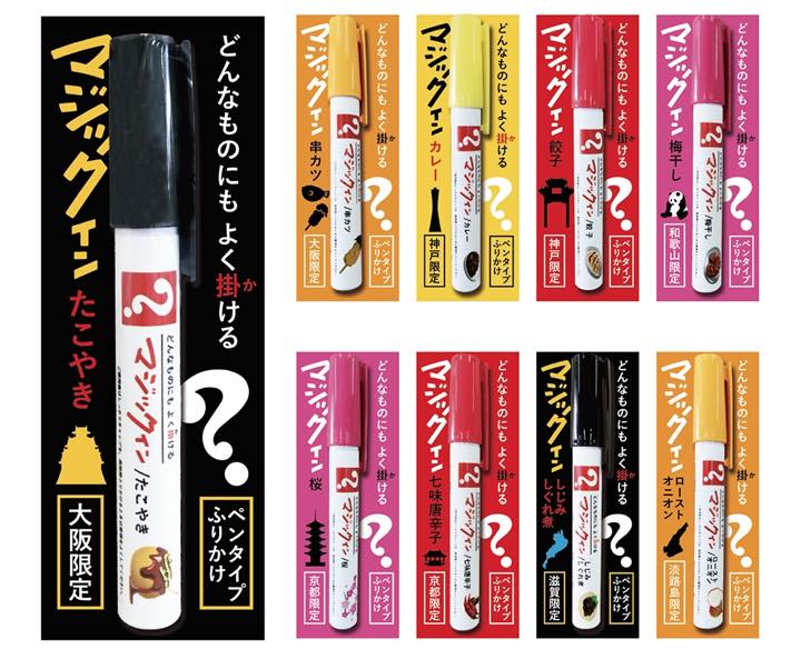 第1弾は関西シリーズとして、大阪限定:たこやき、串カツ、神戸限定:カレー、餃子、和歌山限定:梅干し、 京都限定:桜、七味唐辛子、 滋賀限定:しじみしぐれ煮、淡路島限定:ローストオニオンというオリジナリティ―あふれる全9種類のラインナップ(各6g/中身の補充可能)。