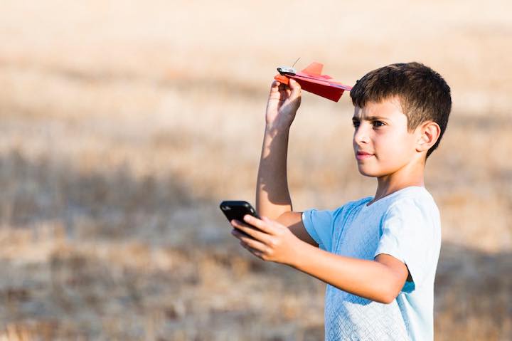 紙製飛行機の前部に超小型のモーターとバッテリーを、支柱を介した後部にはプロペラと尾翼を配置。専用アプリをインストールしたスマホを用意したらフライトの準備は完了。あとは空へ紙飛行機を投じるだけです。