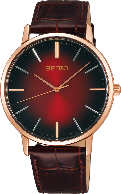 「セイコー ゴールドフェザー デザイン復刻モデル」のレギュラーモデル(2万3000円/税別)はケースと裏ぶたにステンレススチールを採用。全4色のダイヤルカラーに合わせ、ブルーはシルバーが輝くステンレススチールをそのままに、グリーンとピンク(ともに2サイズ)はゴールド色硬質コーティング、レッドはピンクゴールド硬質コーティングが施されています。