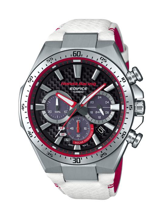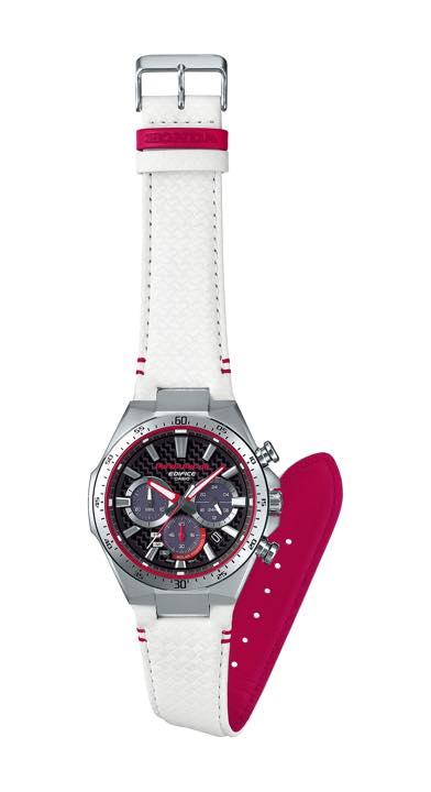 このベースモデルを、Honda Racingのイメージカラーである赤と白に変更。フェイスには各所にアクセントとして赤を使用し、さらにレザーバンドを表を白、裏を赤にして、インパクトのある色合いに。さらに遊環(余ったバンドを止める環)とケース裏にはホンダのロゴを刻印。特にケース裏のEDIFICEとHONDAが並んだ刻印は、レア度高し!