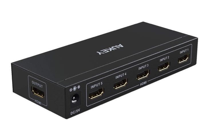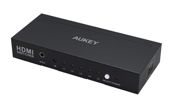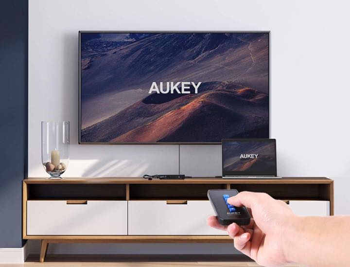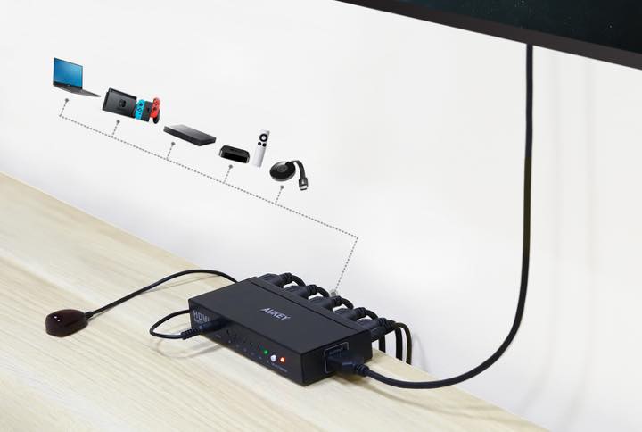 場所を取らないコンパクトサイズは、リビングやデスク上への設置はもちろん、外出先での使用や持ち運びにも便利。遠隔操作に便利なリモコンも同梱するので、HDMI端子が1ポートしかないプロジェクターなどの用途を広げるのにもよさそうです。