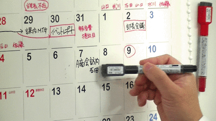 「ロールカレンダー 2019」は、従来からあるホワイトボードのように、市販の専用マーカーで自由に書いたり消したりできます。 でも、これでは従来からあるマンスリーボードと変わりはありません。