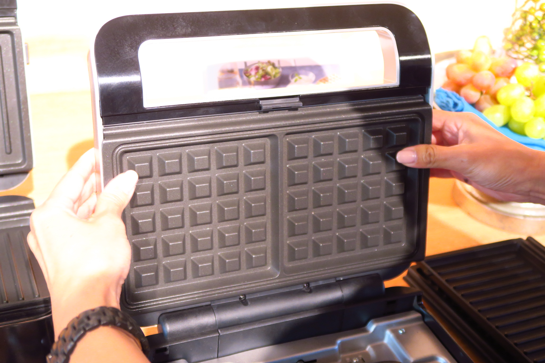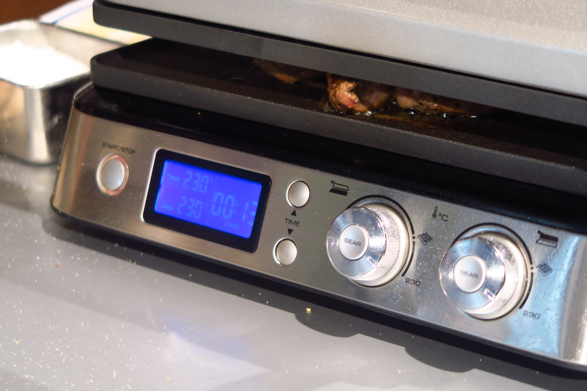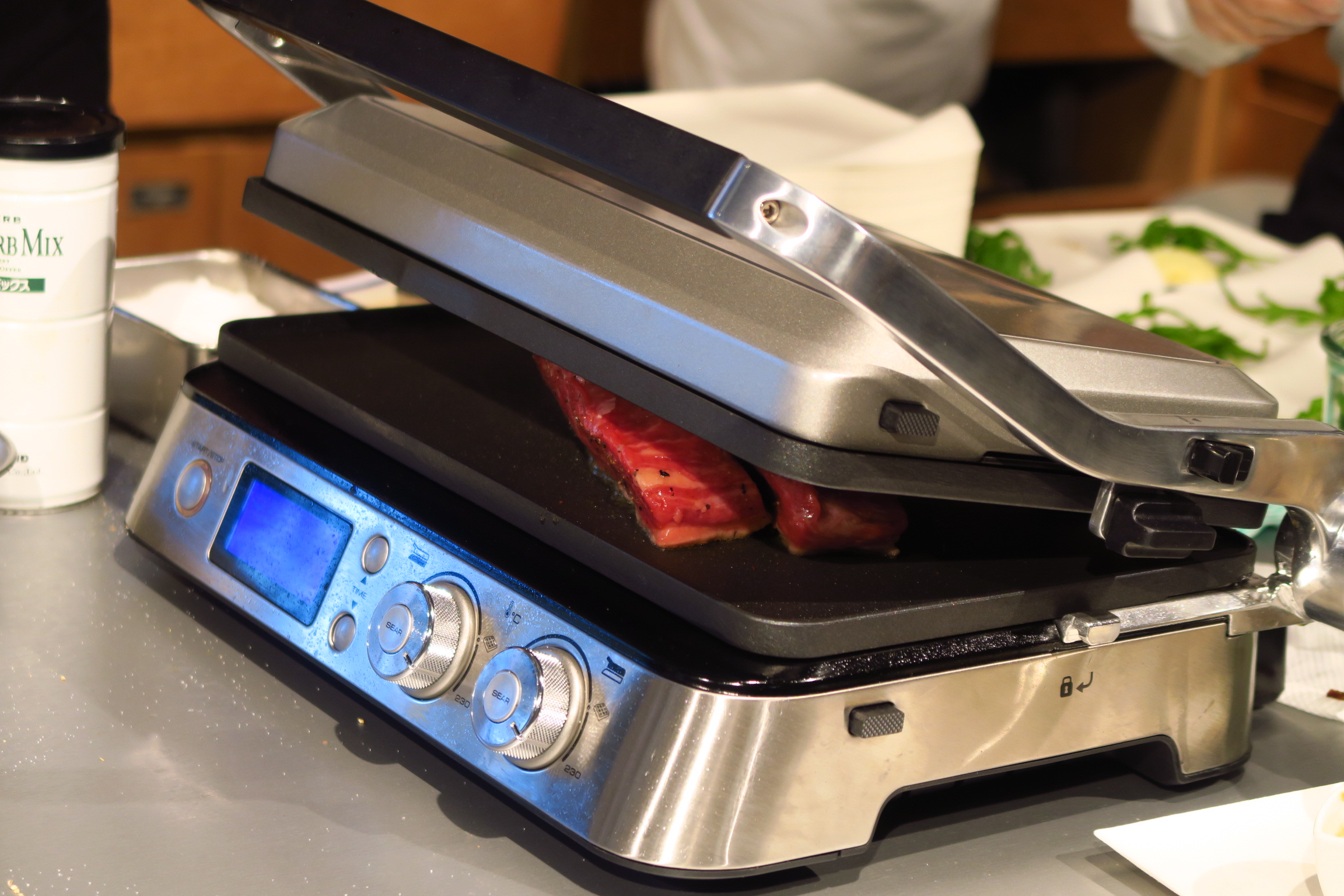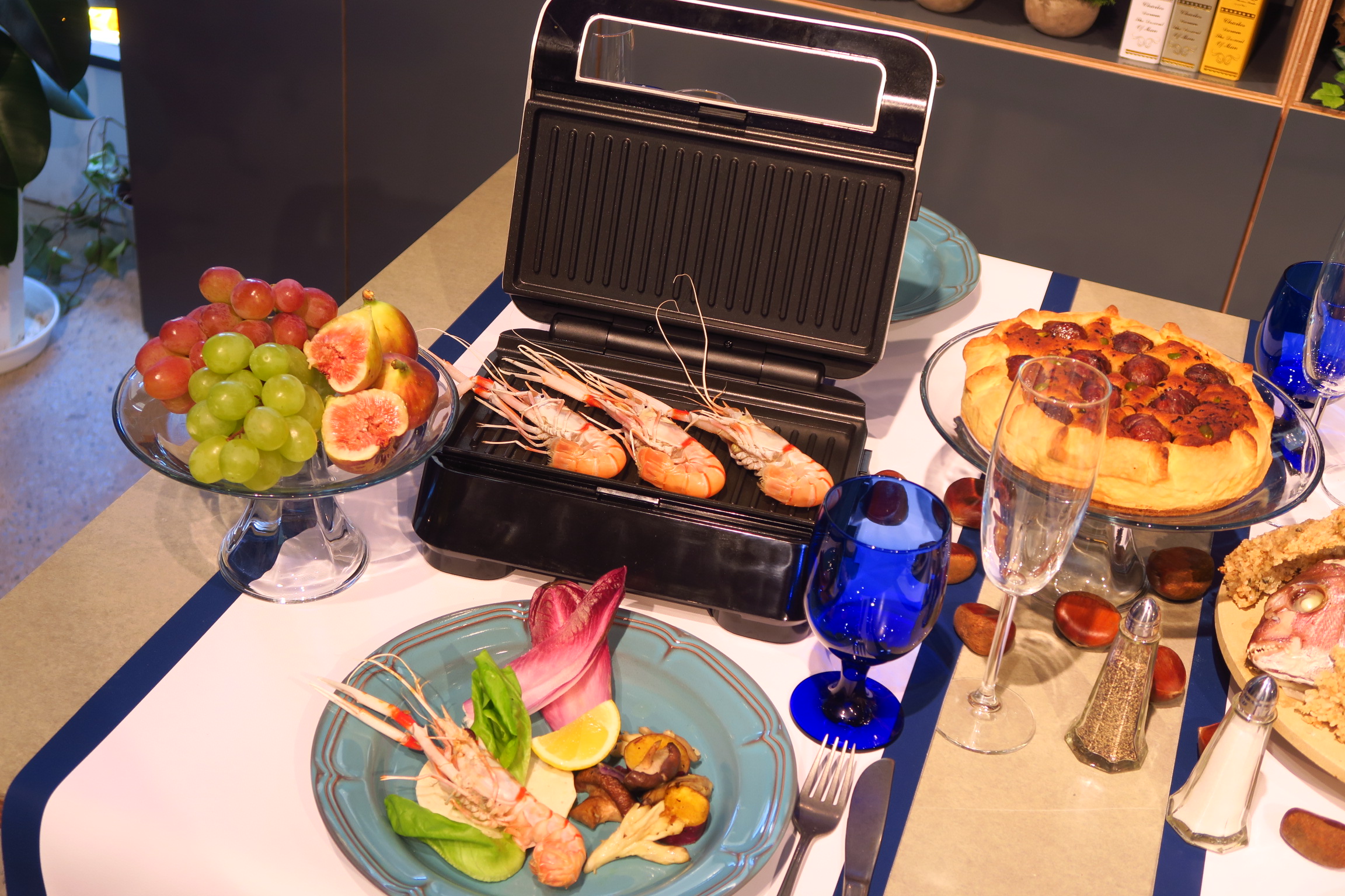 一見するとよくあるホットサンドメーカーのようですが、ホットプレート感覚で肉や魚も焼けるのが魅力。「BBQ & コンタクトグリルプレート」がパーティー料理なら、こちらは毎日の食卓でのグリル料理向きといった感じです。