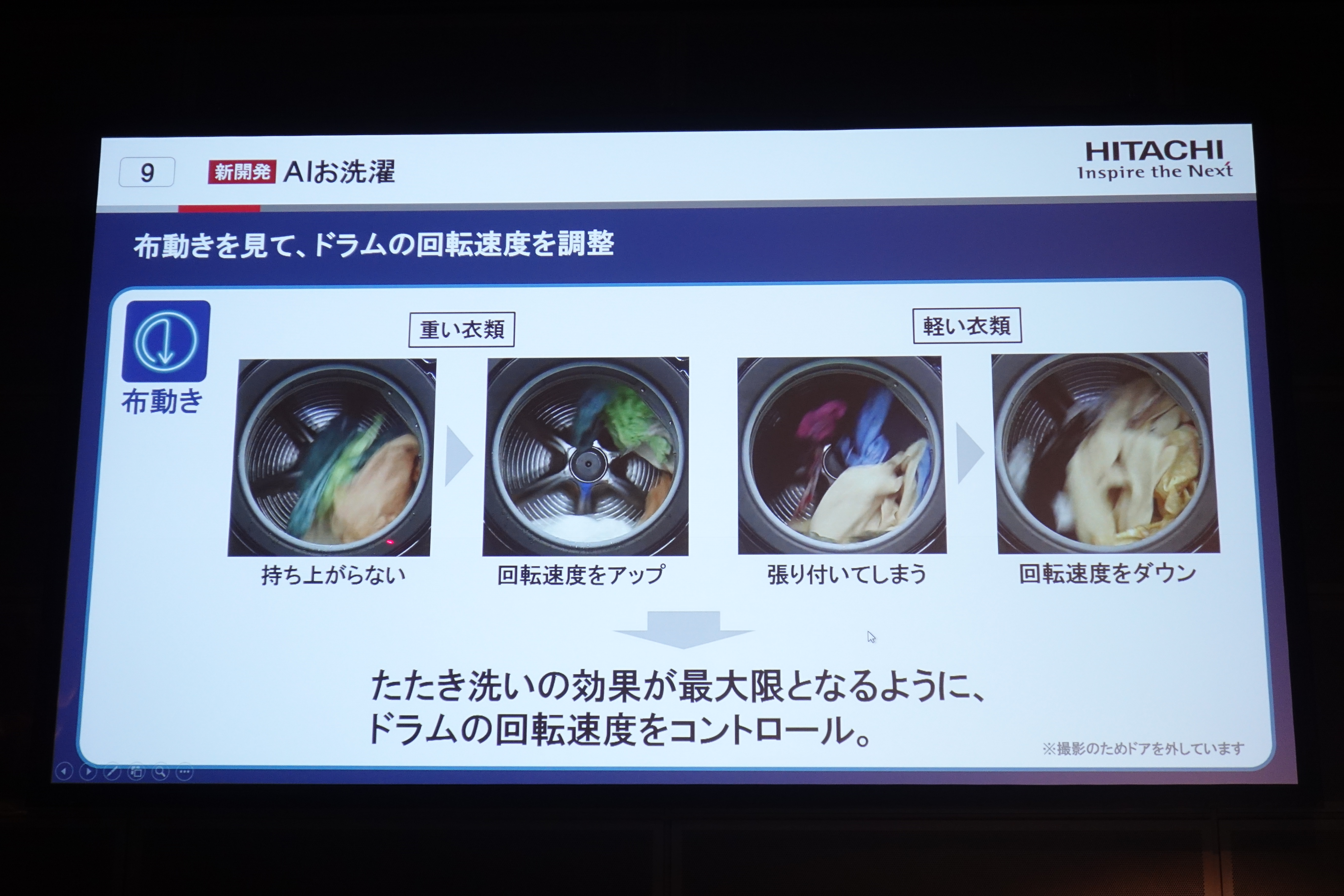また、新機能のひとつとして「AIお洗濯」も追加されました。洗濯する際の布量や洗剤の種類、水硬度や汚れ具合などの状況をセンサーで計測し、「洗い」「すすぎ」「脱水」それぞれの工程で適した制御で運転を行います。