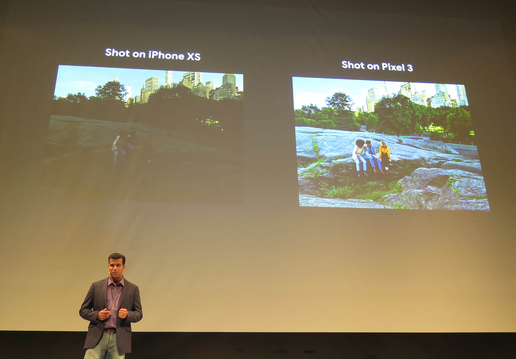 ▲デュアルピクセルよって暗い場所での撮影に強くなったことを、iPhone XSと比較してアピール