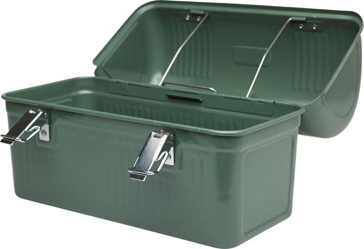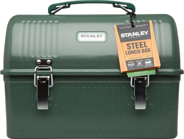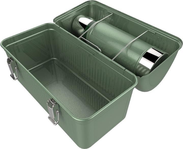 そんなスタンレーのランチボックス、かっこよくないわけがないですよね。耐久性の高いスチール製のボディは、スタンレーのブランドカラーとも言えるハンマートーングリーン。ドーム型の蓋の裏には留め具でボトルを収納することが可能。同じくハンマートーングリーンのクラシック真空ボトル0.75Lがちょうどぴったり収まります。
