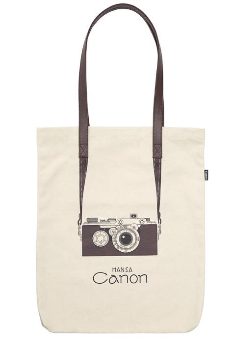 「トートバッグ MC-TO003」(2480円/税別)は日本最初の高級35mmカメラとして1936年に発売された伝説の名機「HANSA Canon(ハンザ・キヤノン)」をモチーフにしたトートバッグ。生産台数が約1000台と非常に少なく、カメラコレクター垂涎のカメラです。