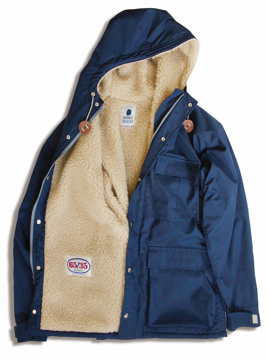 最後は「65/35 BOA PARKA」(2万7000円/税別)。SIERRA DESIGNS BLUE LABELのMOUNTAIN TRAIL PARKAのライニングにボアを採用した新モデルです。表地はポリエステル/コットンの65/35クロスで、60/40と同じく耐久性バツグン。袖はボアなしで動きやすいようになっています。収納力大の大型ポケットはハンドウォーマー付き。