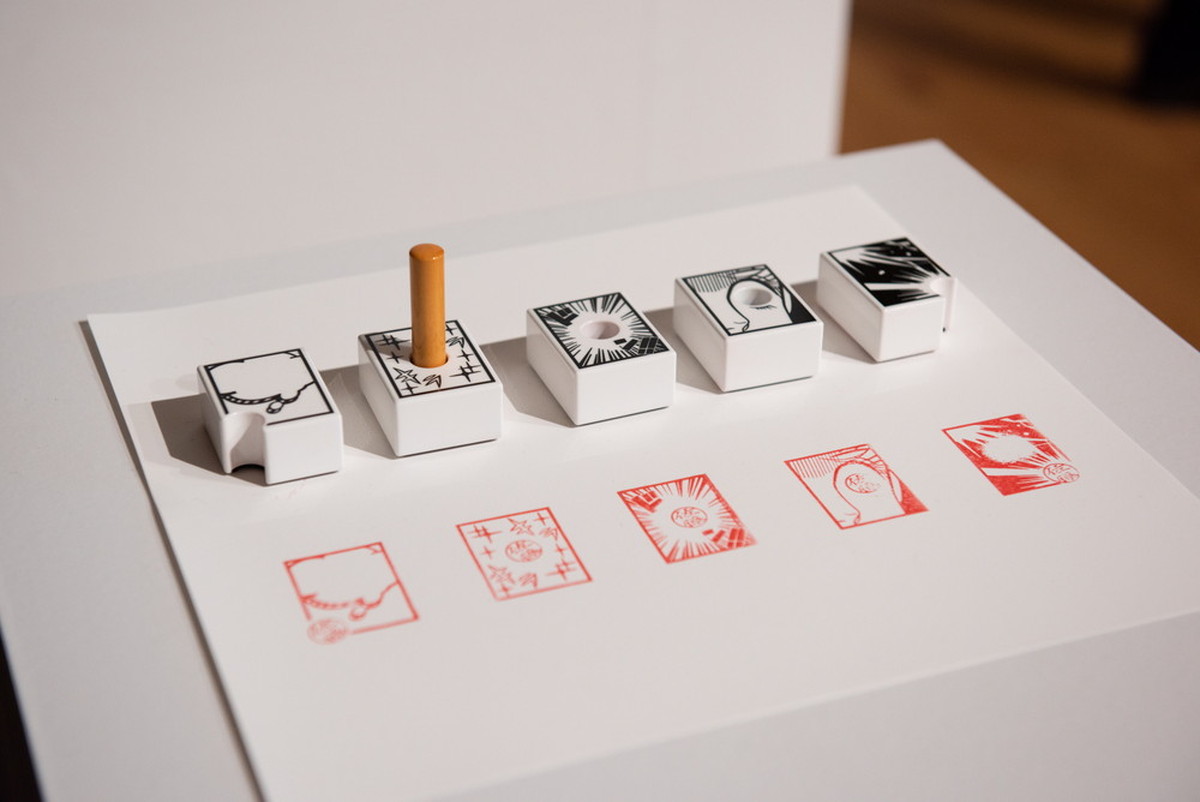 ▲特別審査員賞 榊原伸一さんの「ハンコマ!」。、マンガの1コマの空いている部分にハンコをはめこみ、一緒に押すとマンガの主人公のように名前に息を吹き込むというもの