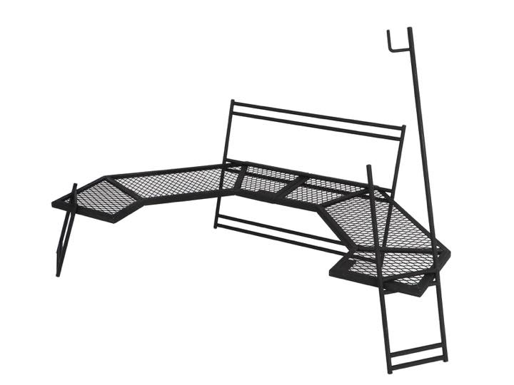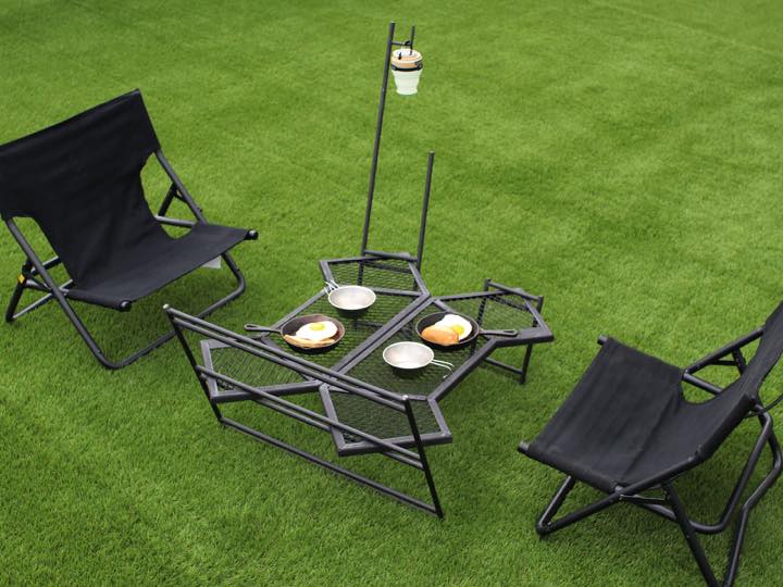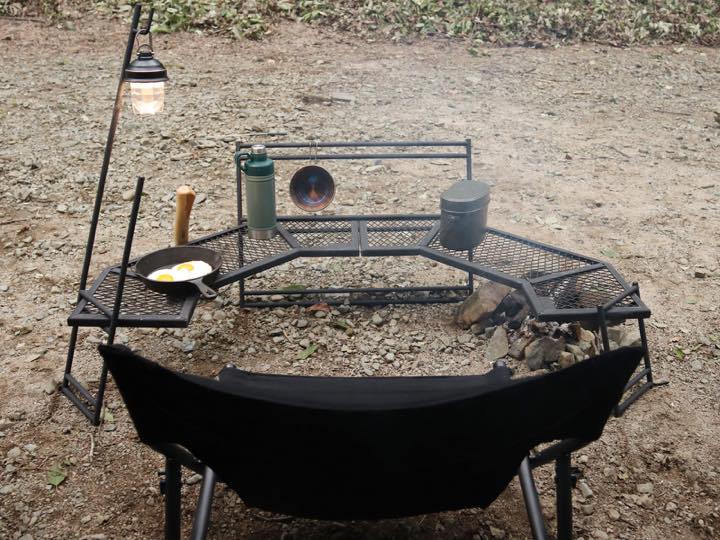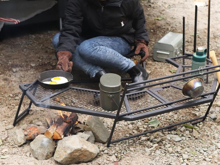 プレートには3mm厚のスチールを使用しており、焚き火の上で使用できます。フライパンや鍋を置いてそのまま調理可能。ひとり用の調理台兼焚き火台兼食事用テーブルとして活躍します。また高さを抑えたため、座面の低いチェアやお座敷スタイルと相性抜群。炎をより感じられる位置に座れるので、焚き火の前で使うテーブルとしておすすめです。