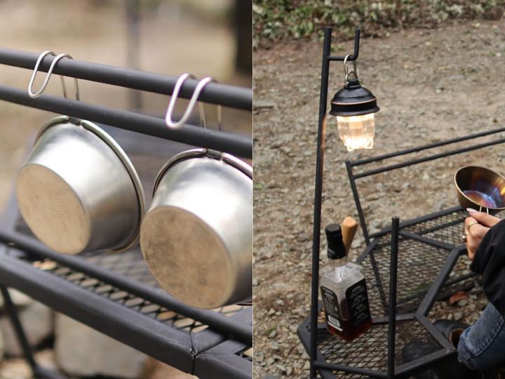 オプションアイテムである「ランタンレッグ」には、ランタンやキッチンペーパーを掛けられ、テーブル正面のレッグ上部にはシェラカップやカラビナなどを吊るせます。