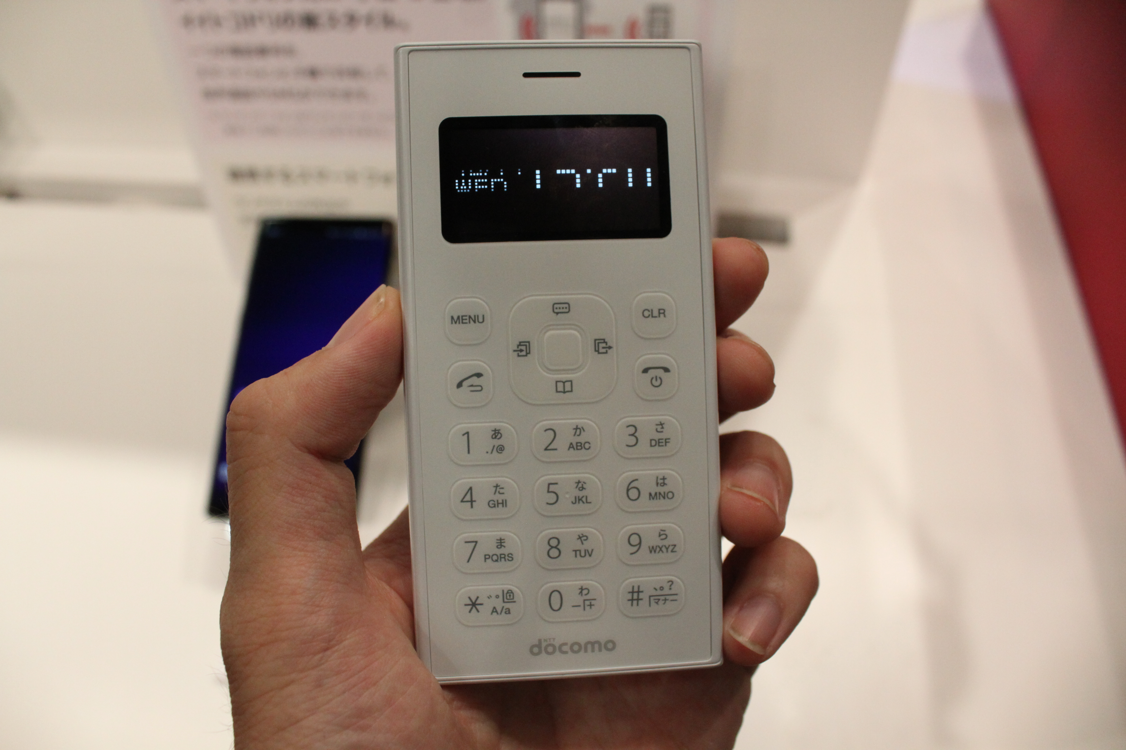 スマホとは別に個性派製品も発表されました。ひとつめは、名刺サイズの「カードケータイ」。“小ささ”と“シンプルさ”というニーズを追求したモデルで、世界最薄・最軽量。大きさはなんと名刺と同じサイズです!