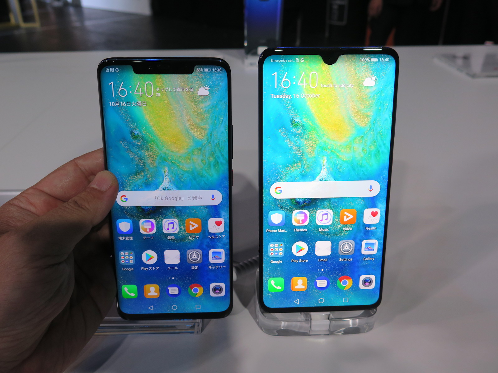 ▲左がMate 20 Proで、右がMate 20。画面がひと回り大きく、ノッチの形状も異なる