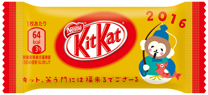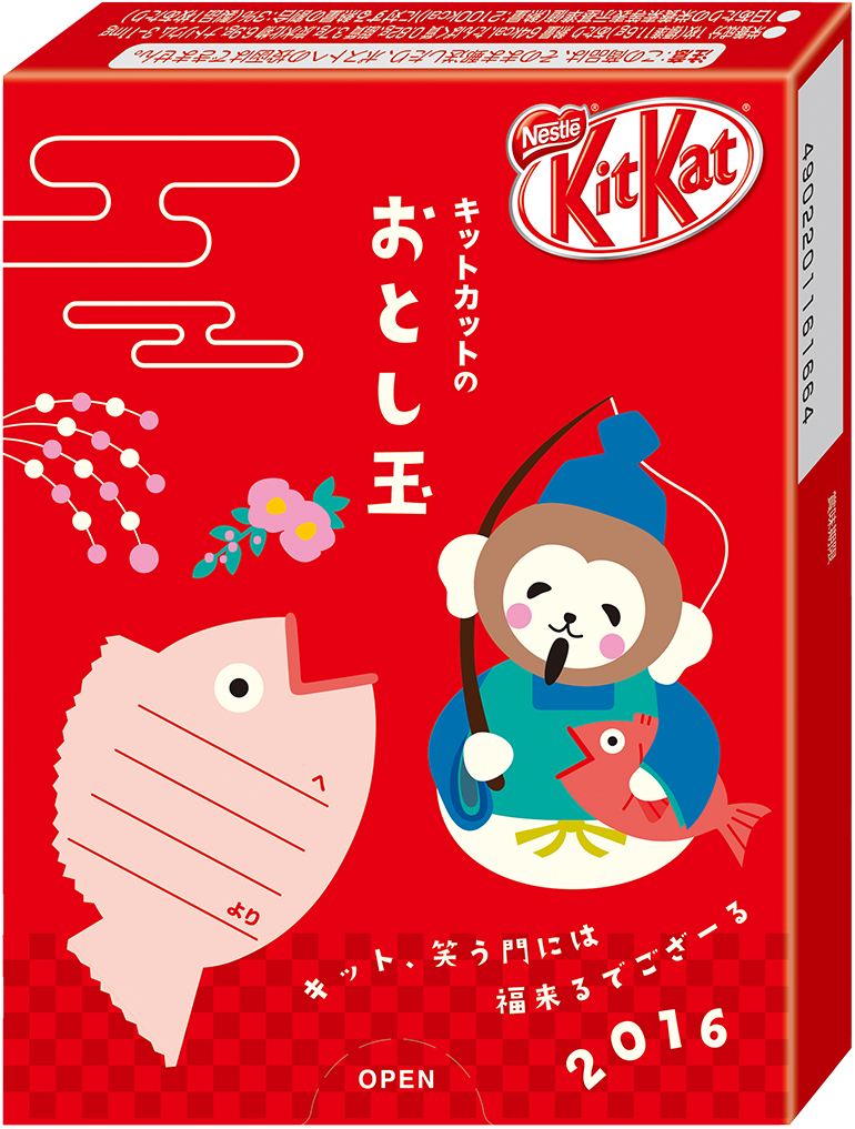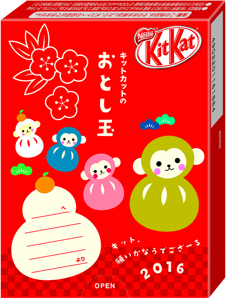2016年のパッケージは、干支のサルをモチーフとしたかわいらしいデザイン。ダルマに扮したサルと「キット、願いかなうでござーる」のメッセージ、恵比寿神サルと「キット、笑う門には福来るでござーる」のメッセージ、招き猫サルと「キット、幸せ招くでゴザール」のメッセージの3種類のデザインの中から選ぶことができる。