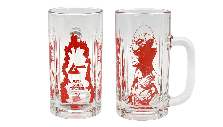 異星人が描かれたビアジョッキです。グレイなのか、ヒト型爬虫類レプティリアンなのか!? 価格は3024円。サイズは、約H16×直径8cm(約500cc)