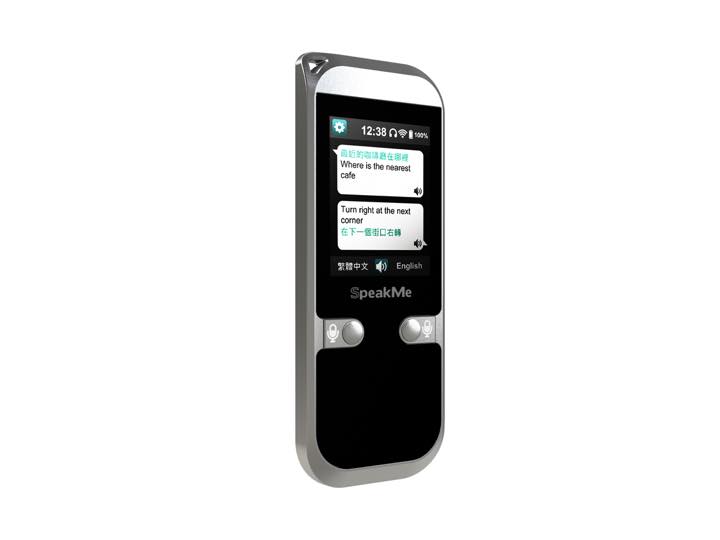 「スピークミィ」は、双方向の翻訳が可能なポケットサイズの翻訳サポートデバイス。複数の翻訳エンジンから最適なエンジンを自動選択し、高精度の翻訳を提供してくれる。使い方は簡単で、トークボタンを押しながら話すだけ。タッチパネルで、翻訳言語の切り替えや音量調整、各種設定などを直感的に簡単に操作できる。