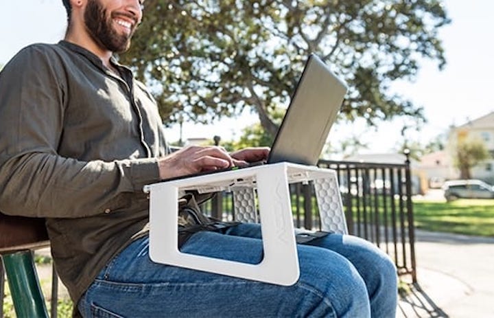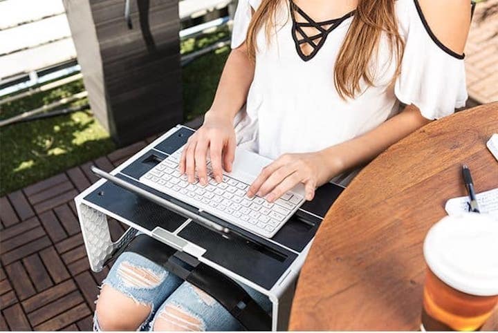 このスタンド、人間工学に基づいたデザインになっており、ノートPCやタブレットなどを目の高さに持ってくることで首などへの負担を軽減し、快適に使用できます。また、両端の脚の間にある2本のレザーストラップにより、自分の膝上にしっかりとフィットするため安定感があるのもポイント。
