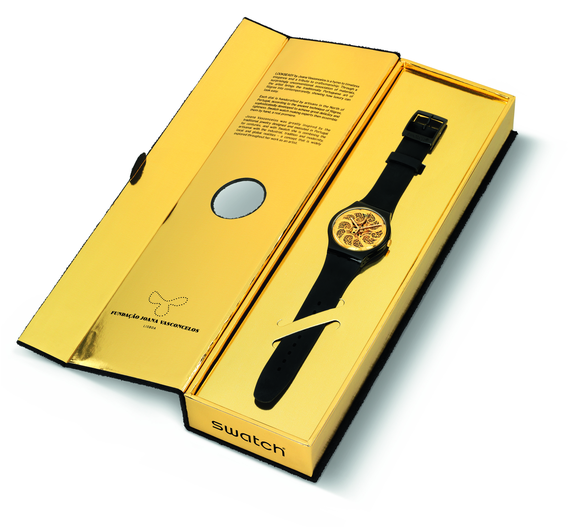目を奪われる、繊細でゴージャスな金細工。このデザインを手掛けたジョアナ・ヴァスコンセロスは、ポルトガル・リスボンを拠点に活動し、ヴェルサイユ宮殿やマンチェスターアートギャラリーで個展を開くなど世界的に活躍するコンテンポラリーアーティスト。彼女のアートセンスに注目したスウォッチが、このたびのコラボレーションを決めたという。