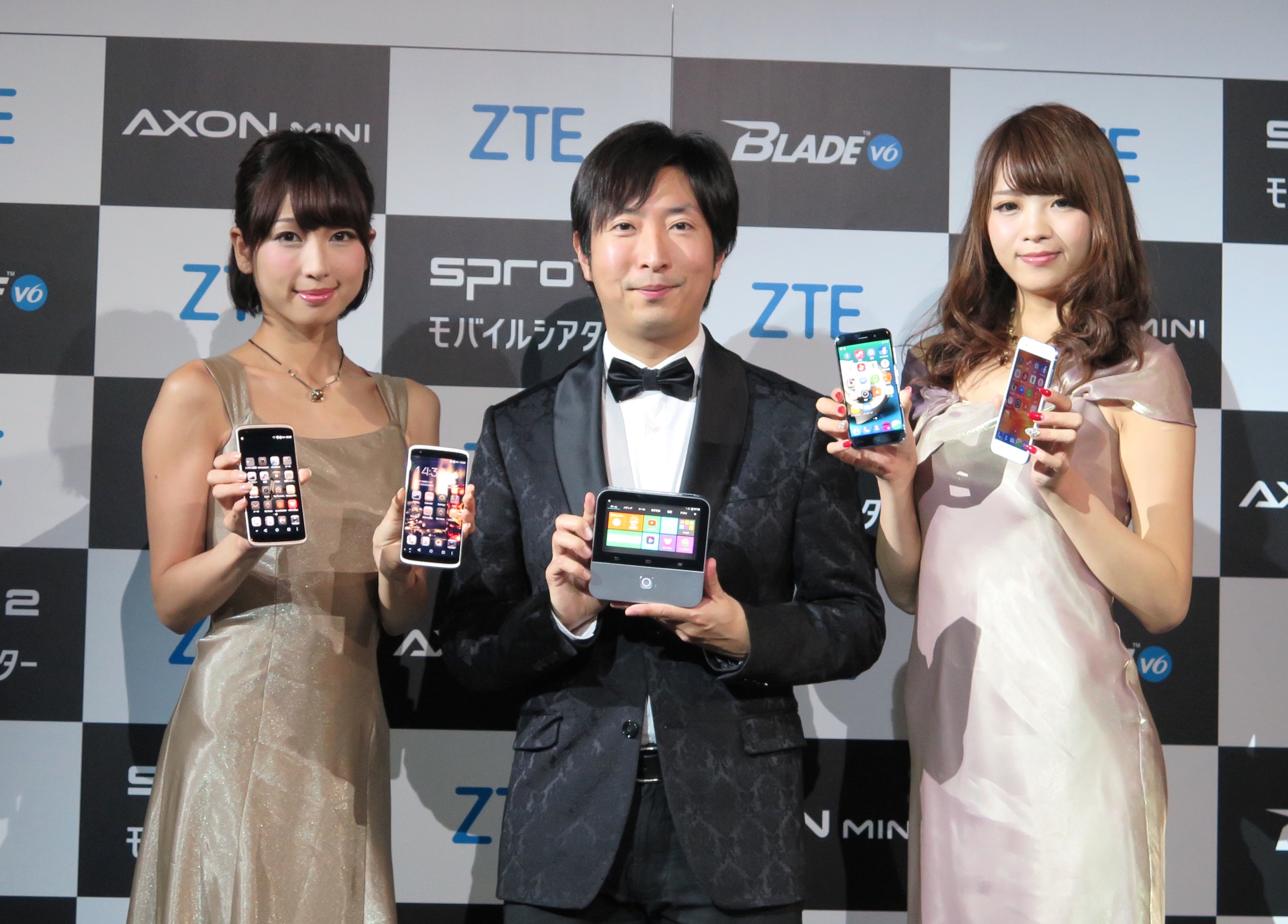 ZTEのSIMフリースマホの発表会にてモバイルプロジェクターも紹介された。映画コメンテーターの有村昆氏(中央)