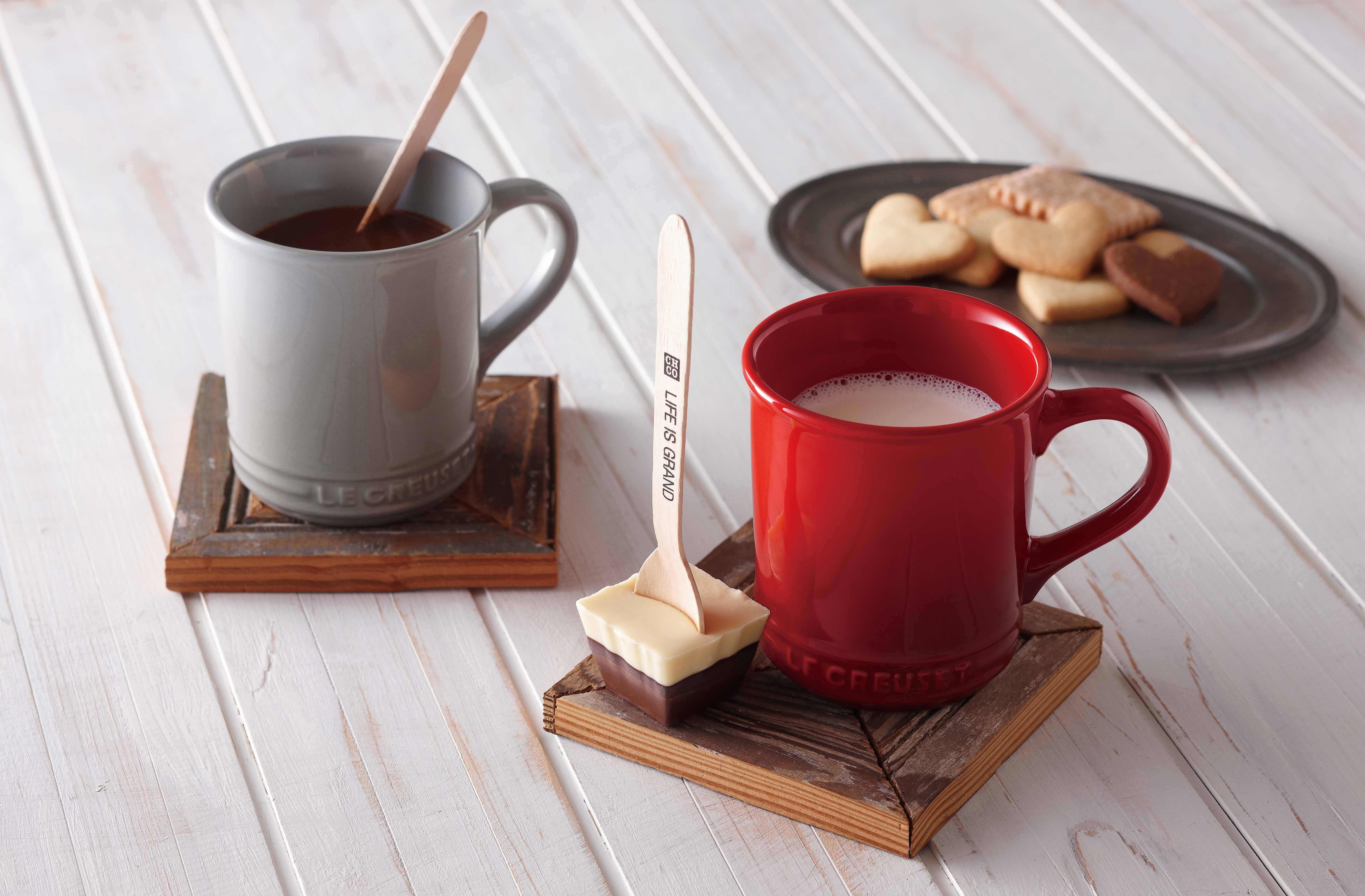 ル・クルーゼのストーンウェアマグカップに、スプーンが刺さったデザインのチョコがセットとなっている。このホットチョコスプーンはオランダ発ブランド「チョコレートカンパニー」のヒットアイテム。