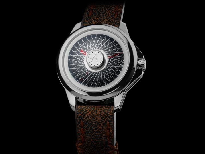 文字盤全面をまばゆく覆うチタニウム製ホイール。スナップを効かせて手首を振れば、精緻なホイールが瞬時に高速で回りだし、やがて姿を見せるホイールの陰に隠れていた時分針……。