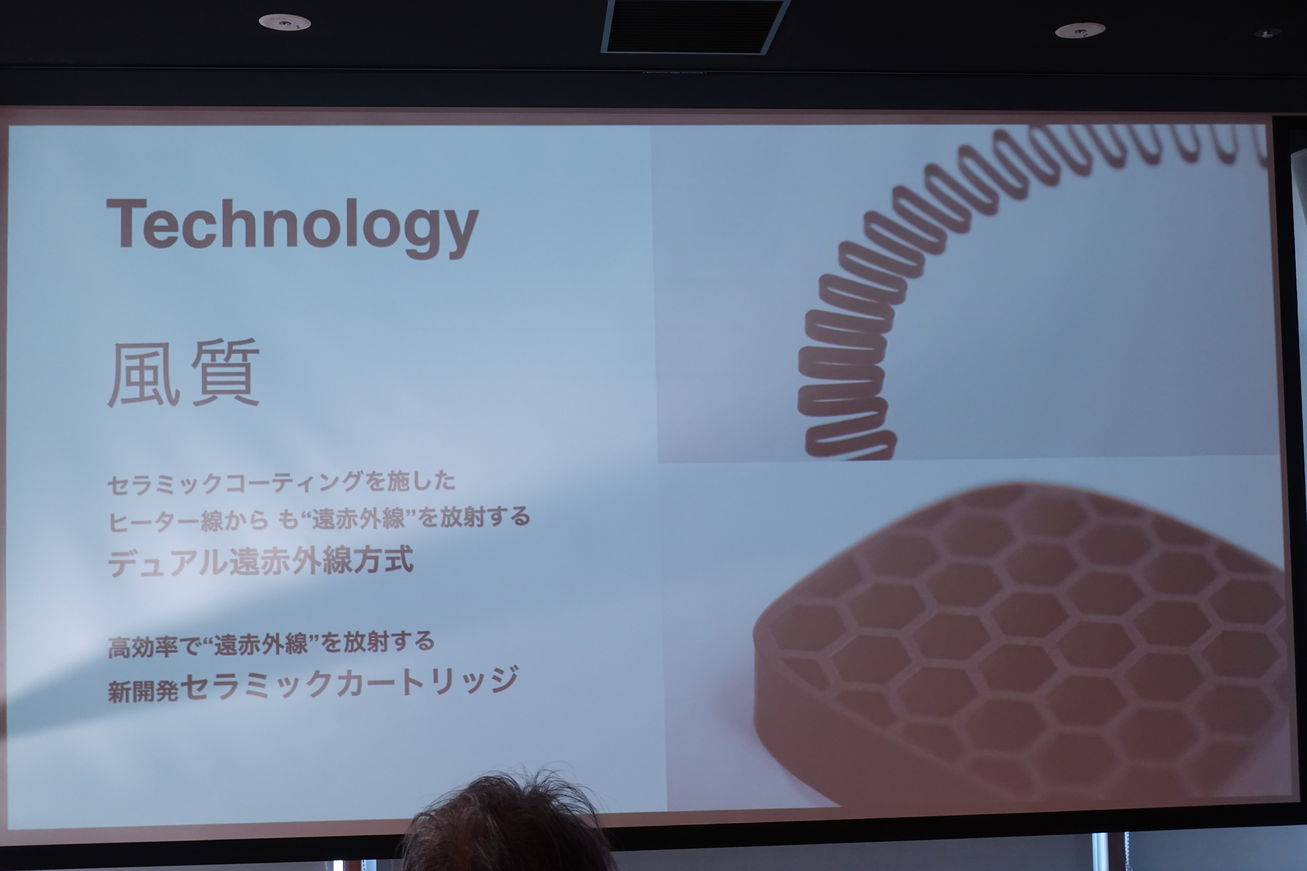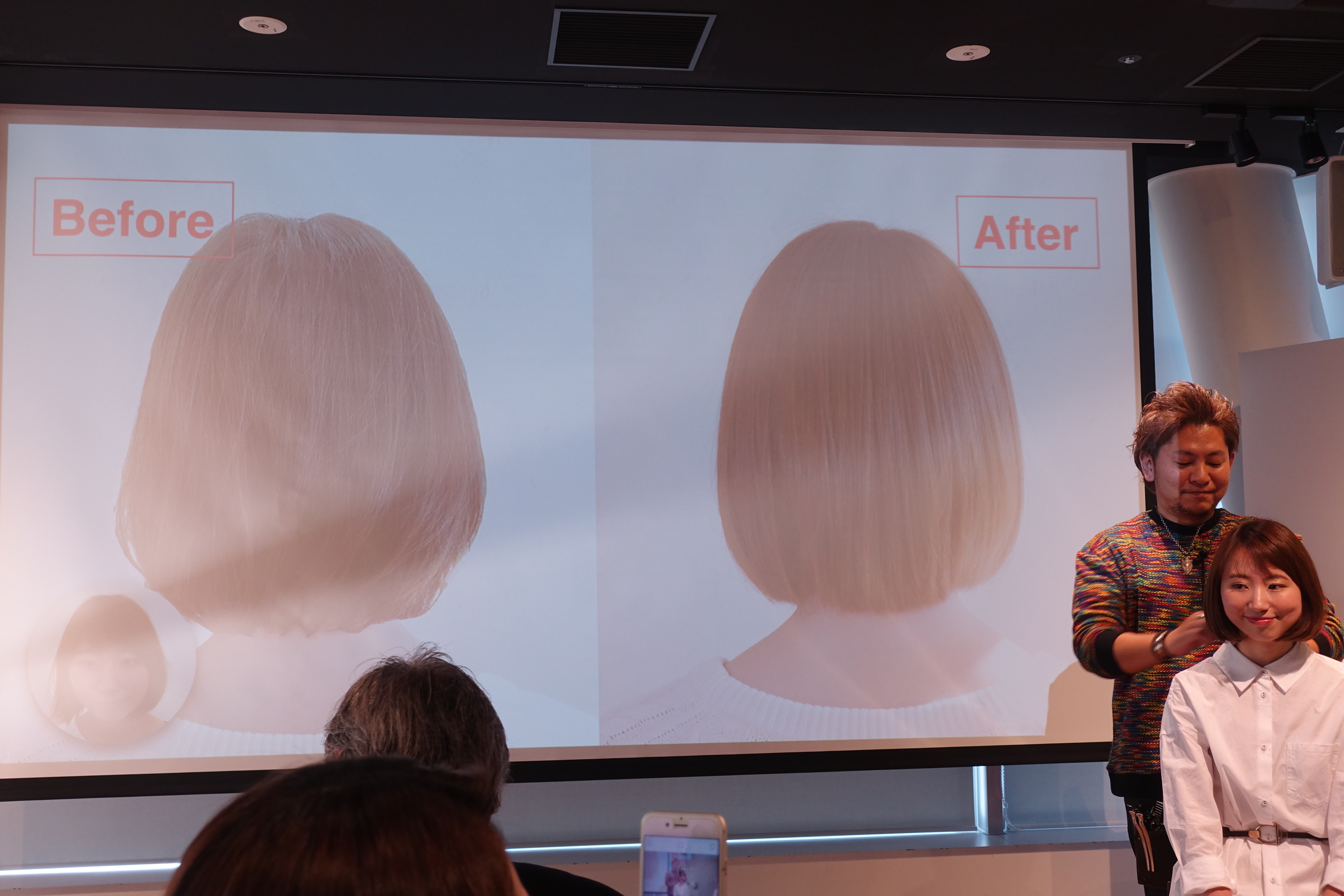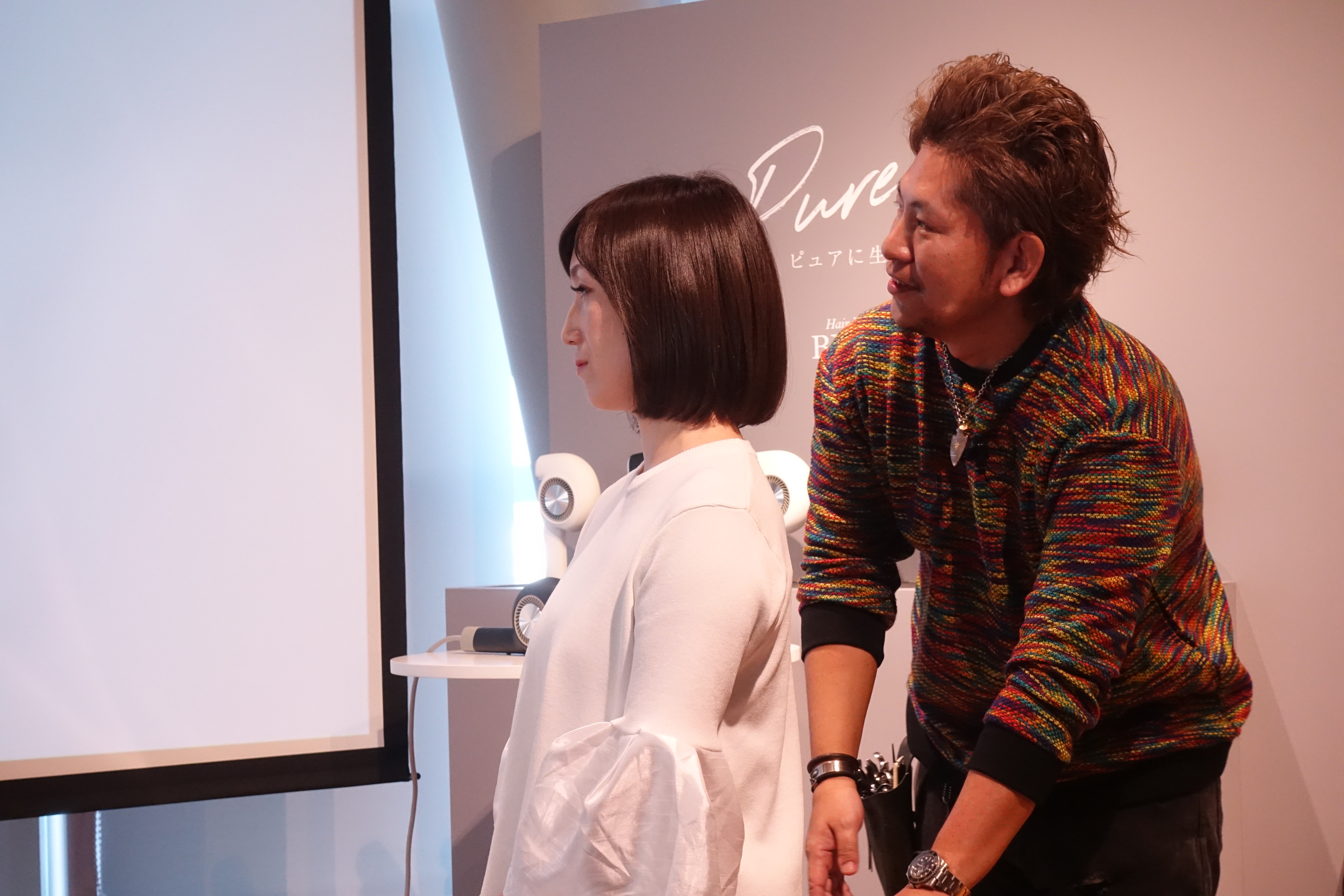 発表会では、美容室を運営する田中大裕さんが「BD-E1」を使って実演。ふたりのモデルの髪を乾かし、ドライヤーのみでのヘアセットを披露しました。