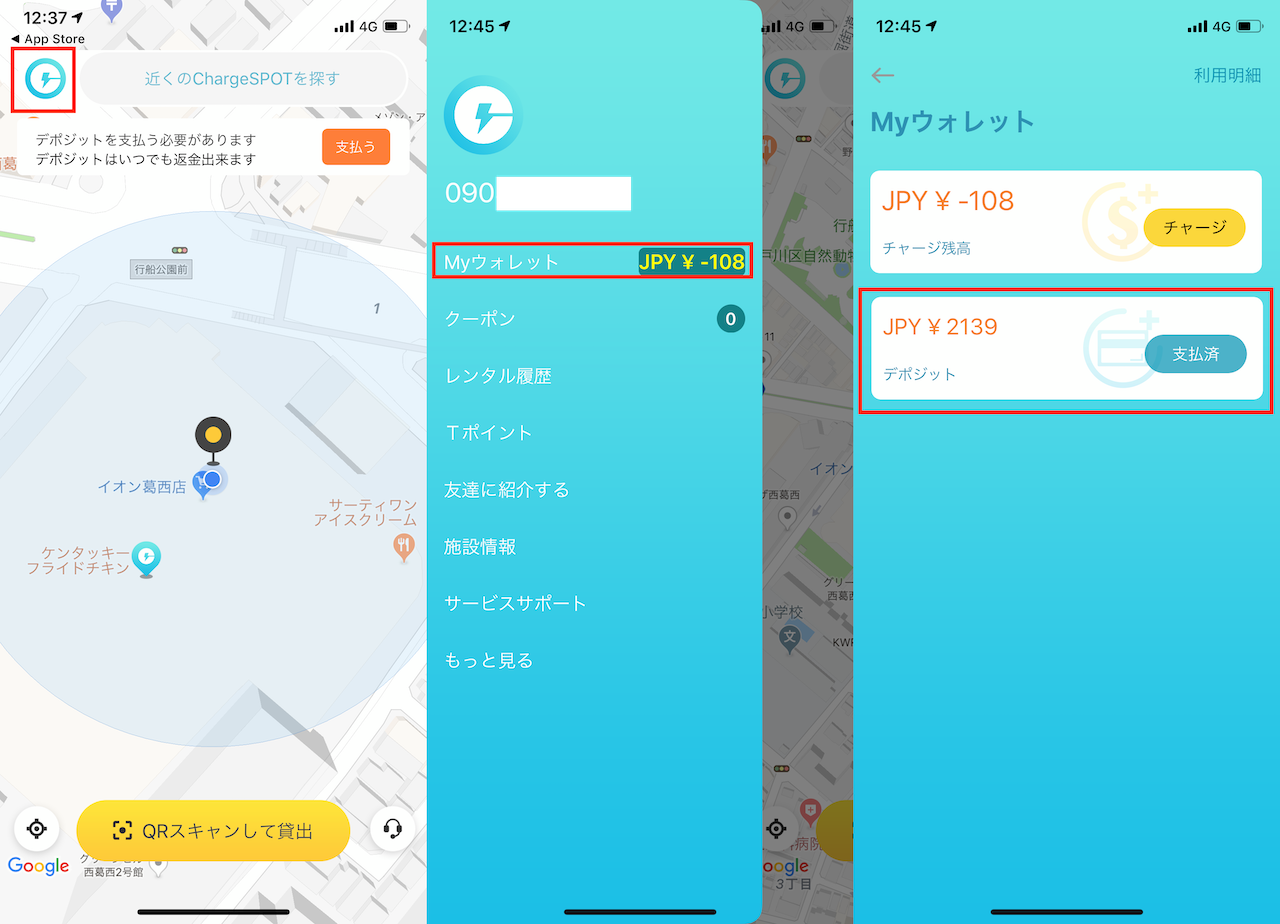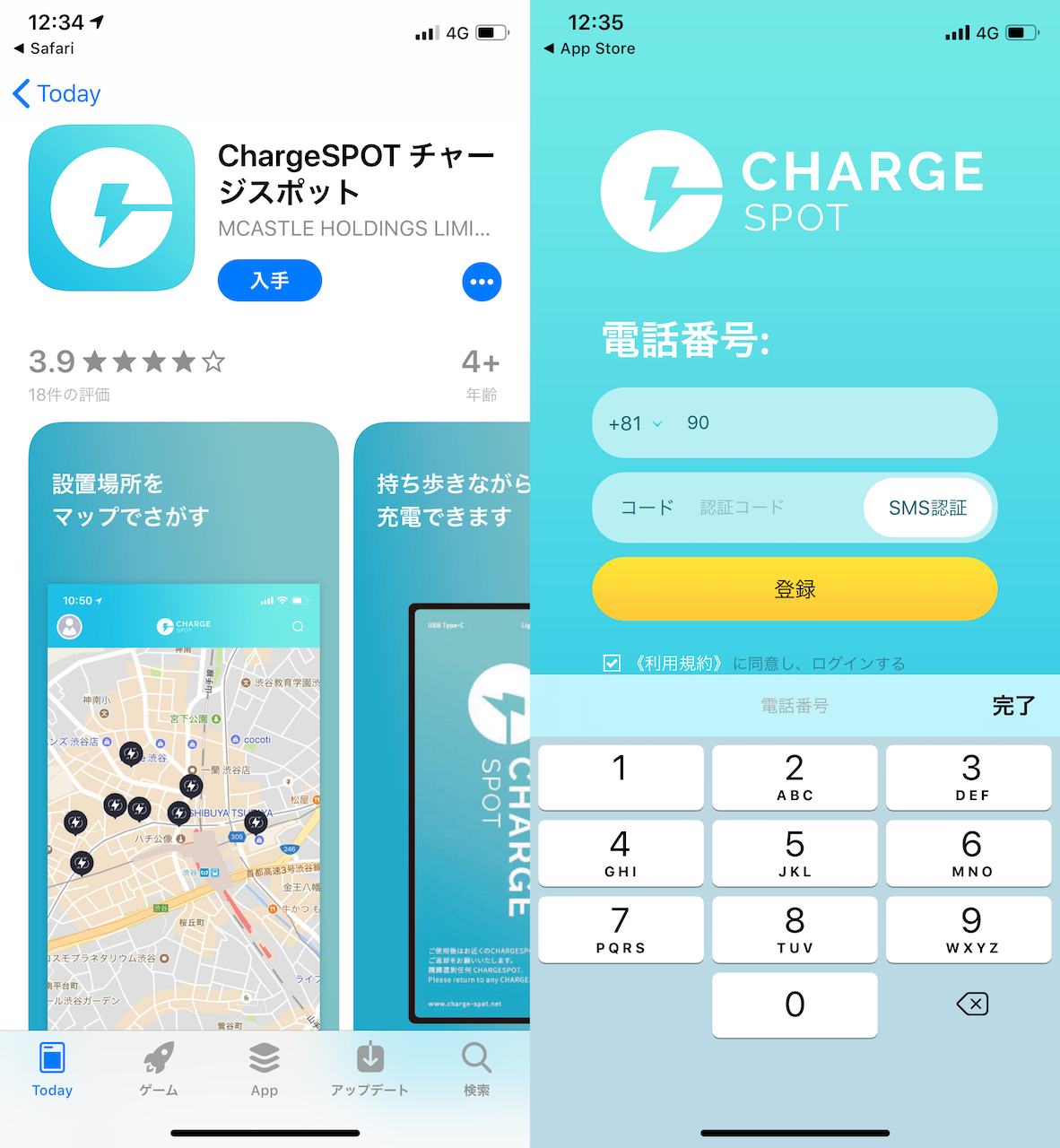 ▲「ChargeSPOT」アプリをインストールして、SMS認証を済ませよう