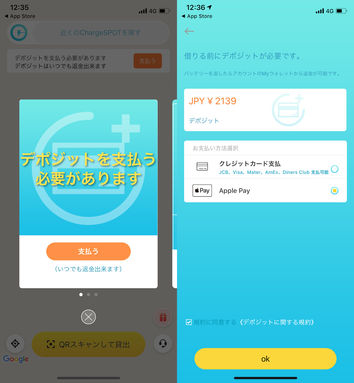 最初に、1980円(税込2139円)のデポジット(端末保証代金)を支払う必要があります。これは、使用したモバイルバッテリーを返却すれば返金されます。