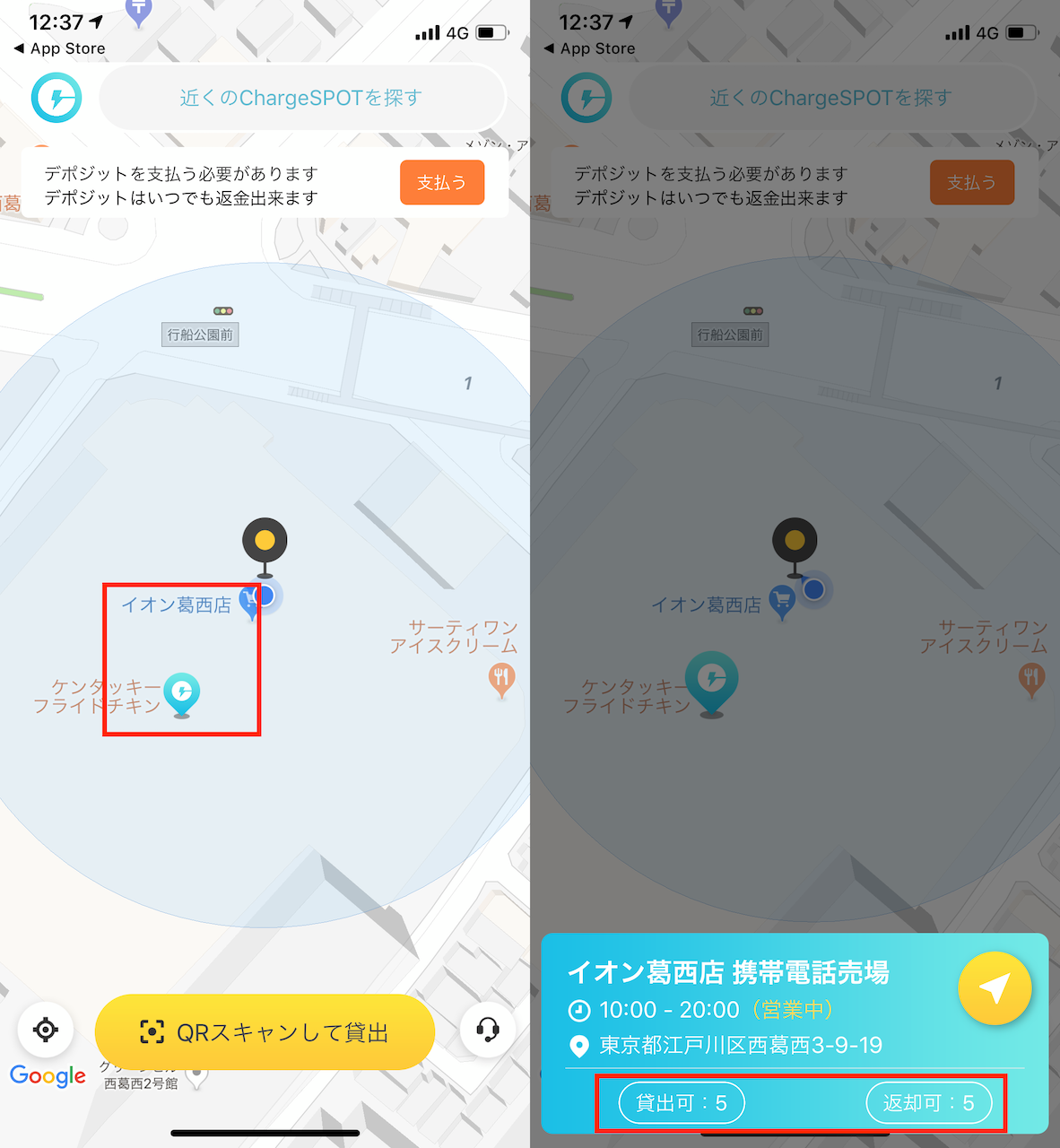 ▲地図でアイコンをタップすると、モバイルバッテリーの貸出、返却可能な数がわかる