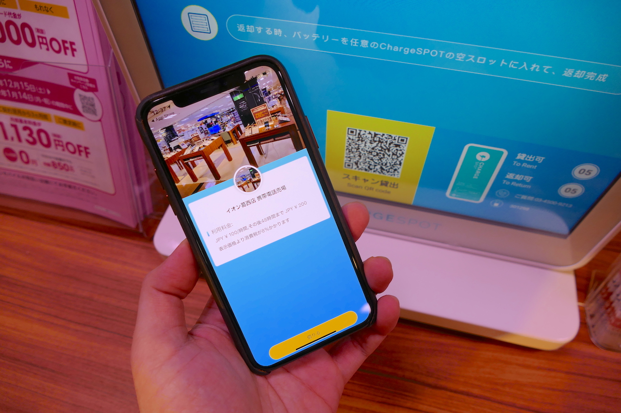 「ChargeSPOT」は、INFORICH(インフォリッチ)が提供するモバイルバッテリーのシェアリングサービスです。本州・四国の「イオン」「イオンスタイル」、そしてイオンモバイル八重洲など約170店舗に設置されたスタンドから有料でモバイルバッテリーをレンタルできます。なお、スタンドが設置してある店舗は、専用のアプリから確認可能です。
