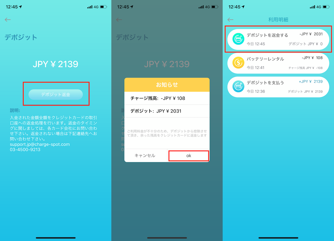 ▲デポジット返金をタップすればOK。なお、今回の手順ではチャージを行なっていないので、デポジットから使用料金108円が引かれ、その差額が返金される仕組み。利用明細画面(右)をみると差額が差し引かれているのがわかる