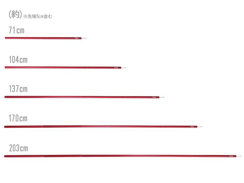 メリットはコンパクトさだけではない。6本継ぎになったため、5段階の高さに変更が可能になっているだ。連結するポールの本数を変えることで、約71cm / 104cm / 137cm / 170cm / 203cmと調整できる。しかも連結はボタン式のため、組み立ても簡単。