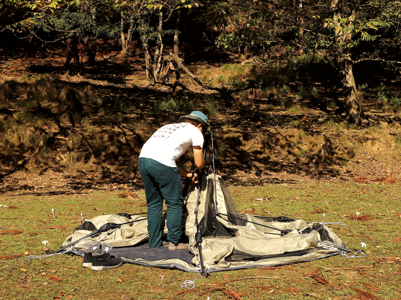 「キノコテント」は、フレームを設置したら後は傘を開くようにテント地を上へ向かって広げてフレームと地面に固定すればインナーテント(内壁部)の設営は完了。さらにフレームの外側から屋根となるフライシートをかぶせて広げ、紐を地面にペグで固定。簡単な作業でその名の通り、キノコ型のドームテントが完成します。