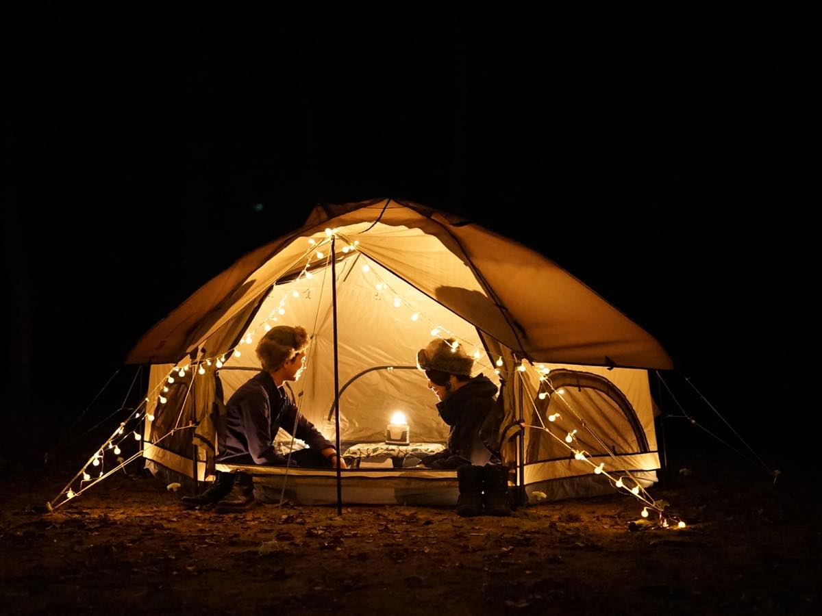 冬キャンと同じく、現在大ブレイク中のセルフグランピング用としても使うことができる、簡単設営とワイドなサイズが嬉しい「キノコテント」。家族や気心の知れた仲間たちと、楽しい夜のひと時を過ごしてみてはいかが?